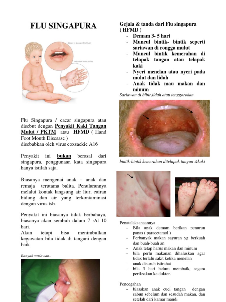 FLU SINGAPURA Bukan Penyakit Berbahaya dan Dapat Dicegah Di dunia kedokteran tidak ada istilah Flu Singapura ini adalah Penyakit Tangan Kaki dan Mulut PTKM atau Hand Foot Mouth Disease HFMD yang disebabkan oleh virus. Yang umum terjadi pada anak-anak dan disebabkan oleh enterovirus seperti coxsackieviruses dan. Selain itu cegah kontak aneka benda dengan mulut pesan Elvira saat ditemui di Jakarta Selatan Senin 2632018.